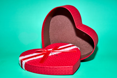 red heart shaped box, open, on a teal background