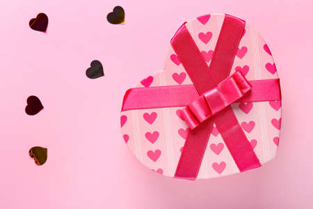 Pink romantic holiday background with with heart-shaped gift box. Decorative card for St. Valentine's Day with space for text.