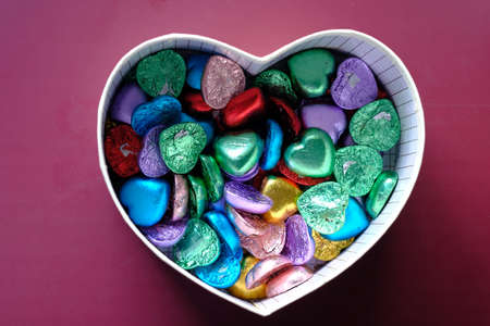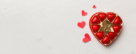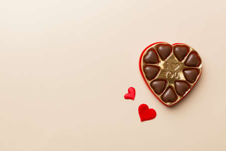 Delicious chocolate pralines in red box for Valentine's Day. Heart shaped box of chocolates top view with copy space.