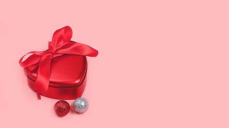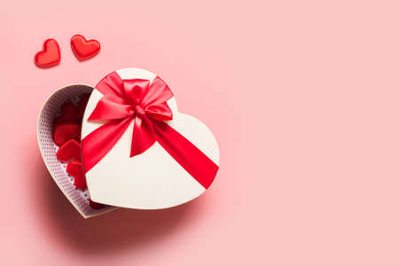 Valentines Day romantic box in shape of heart with red bow on pink background. View from above. Flat lay. Greeting card with copy space or love letter.
