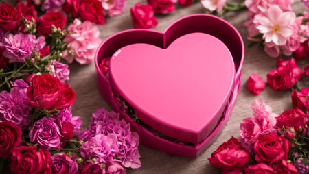 Beautiful heart shaped box, flowers background