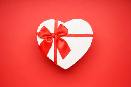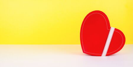 Red heart shaped gift box with ribbon on white table and colorful yellow background with copy space. Romantic, love composition for woman's day, valentine's day, mother's day celebration. Stock photo.