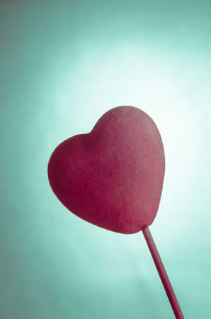 Soft fabric velvety pink heart on a stick against turquoise background.