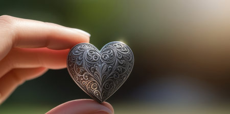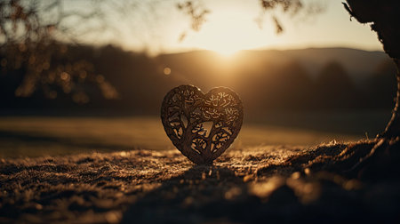 Beautifully carved wooden heart, featuring intricate floral patterns, presented on a dark background with dramatic lighting. Symbolizes traditional craftsmanship, lasting love, and natural artistry.