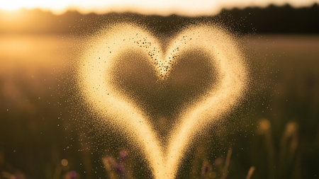 A heart shape made of golden sand particles glows in the warm sunset light with bokeh.