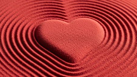 A heart shape is imprinted in red sand, surrounded by concentric ripple patterns in a zen garden style.