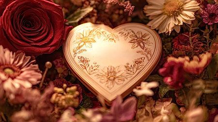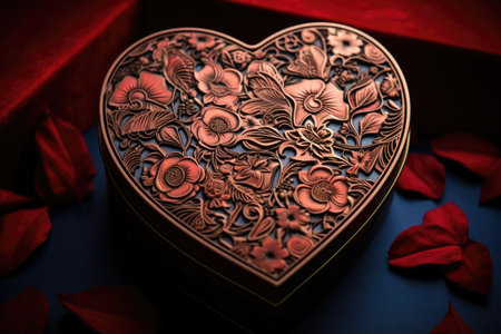 Heart-shaped box for Valentine's Day with flowers and petals, A detailed, intricate floral design on a Valentine's Day gift box, AI Generated