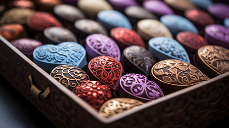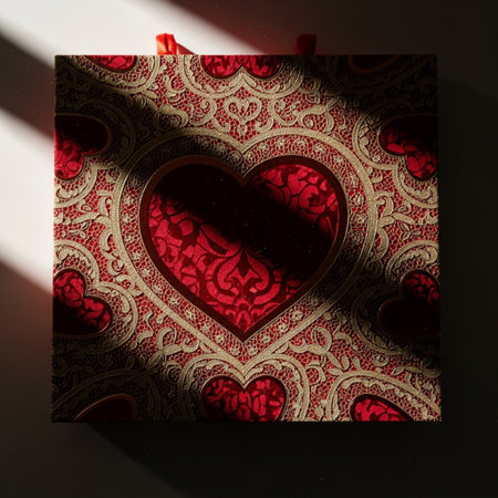 Gorgeous heart-shaped boxes with intricate designs resting on a wooden surface, beautifully capturing textures and soft light, perfect for romantic gifts.