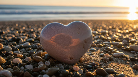 A heart-shaped rock sits prominently on a pebbled beach, with the warm hues of a setting sun casting a golden glow over the scene. The serene backdrop of the ocean and the tranquil atmosphere evoke a sense of peace and romance.
