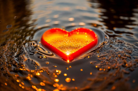 object heart-shaped glowing warm light Floating on a puddle of water, the light reflects on the surface of the water. ai generative