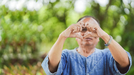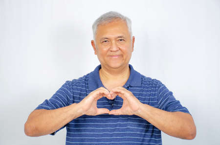 Elderly Thai men make their hands into a heart shaped symbol. Copy space.