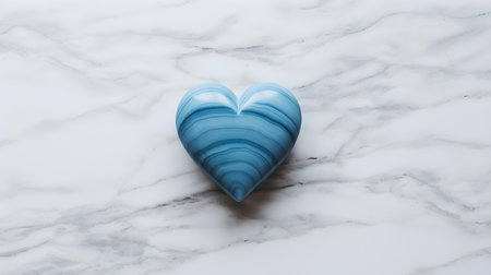 Top view of a blue heart on a white marble background. Romantic backdrop with copy space