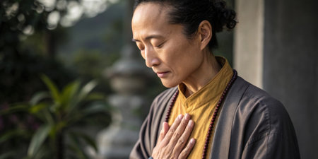 A focused expression on a persons face as they practice breathing techniques with their hand gently resting on their heart. The image emphasizes mindfulness and connection to ones.