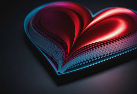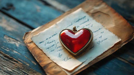 Red glass heart on a book's pages, capturing the essence of romance in a tranquil, literary setting. A.I.