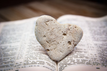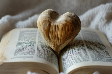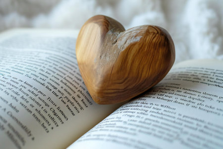 Digital image of open book with a wooden heart on top of it, high quality, high resolution