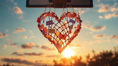 Valentine's Heart. A heart-shaped net filled with colorful notes hangs from a basketball hoop against a sunset sky.