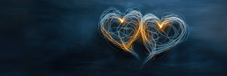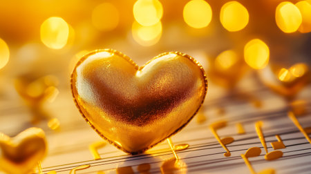 Golden heart shapes made of music notes shine beautifully, evoking romance and creativity in a magical atmosphere.