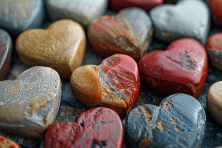 Close-up of handcrafted heart-shaped stones with varied textures and colors, symbolizing love and craftsmanship.