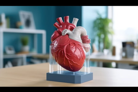This image captures a close-up of an anatomically correct model of a human heart in a medical setting.