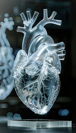 A detailed sculpture of a human heart placed on a table, with intricate features and transparency, possibly made of glass or another material