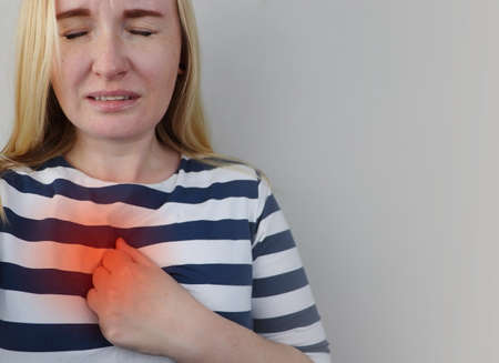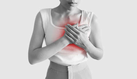 Woman touching chest. Heart attack, heart disease, and chest pain concepts, on white background