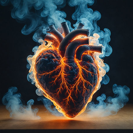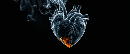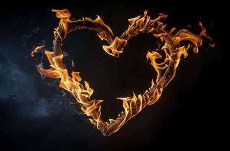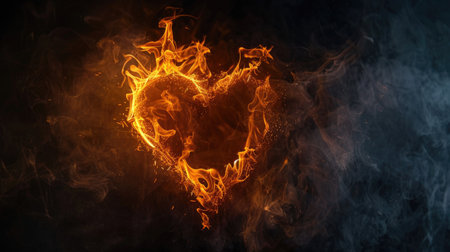 Burning heart shape with fiery flames, representing love and passion against a smoky black background