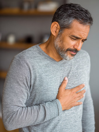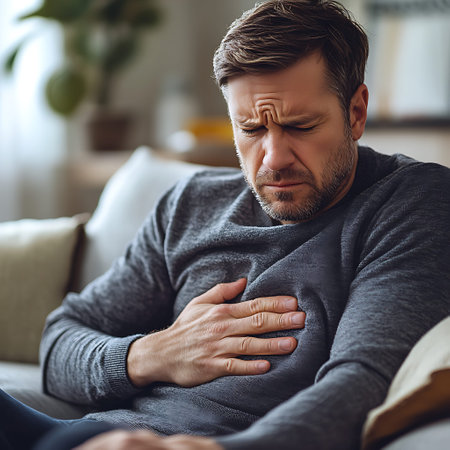 A man in a grey sweater places his hand on his chest, indicating discomfort. His expression portrays concern and anxiety in a cozy indoor environment with a soft background.