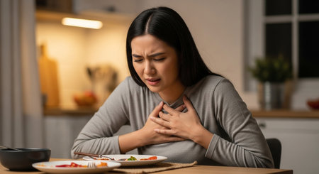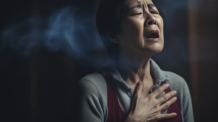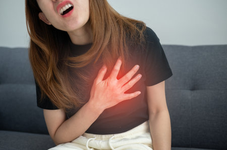 Woman suffering from acute chest pain, clutching her chest with one hand while her face shows discomfort, indicating a potential heart attack or other cardiac condition