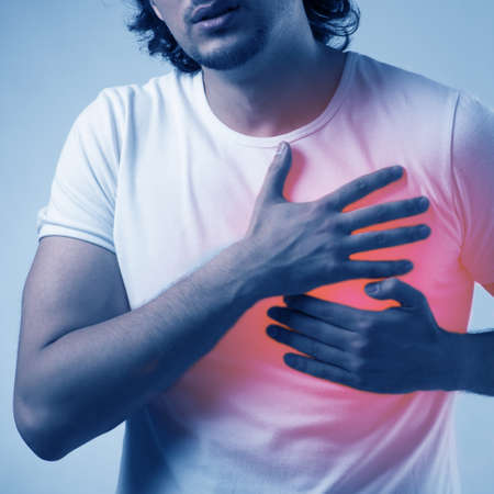 Man having a heart attack. Man holding his chest in acute pain. Heart attack symptom-Health and medical concept. Painful area highlighted in red