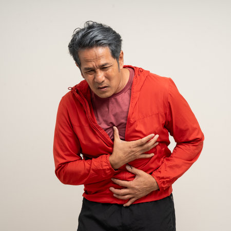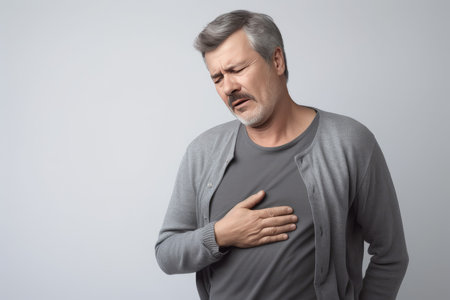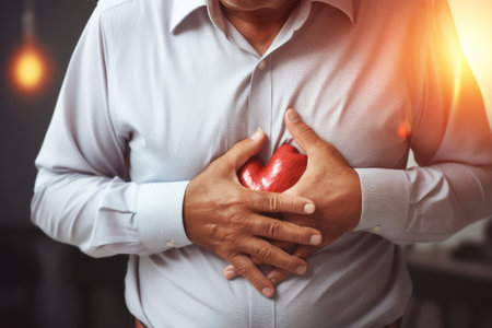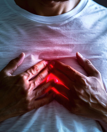 An elderly man clutching his chest in pain, with a glowing red spot indicating discomfort, suggesting a health issue or heart problem.