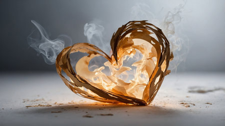 A red paper heart on a white background with smoke. The heart symbolizes love, while the smoke represents heartbreak, making it ideal for stories about loss and emotional pain.