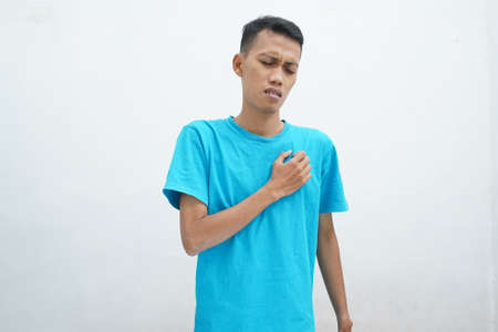 Asian young man suffering from central chest pain. Chest pain can be caused by heart attack, myocardial infarct or ischemia, myocarditis, pneumonia, oesophagitis, stress, etc,.