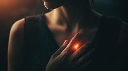 In a dimly lit environment, a person gently touches a warm, glowing light on their chest, reflecting introspection and deep emotions. The serene atmosphere highlights the moment's significance.