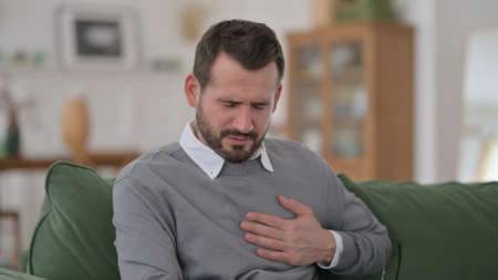 Suffering man with bad chest pain having a heart attack while sitting on the couch. Latin man suffering from coronary issues