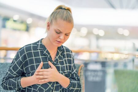 woman with sudden heart attack; sick woman suffering from acute heart attack, concept of emergency health care; young adult woman model
