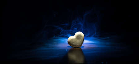 Valentines background. Valentine's Day heart on a dark wooden table. Dark toned foggy background. Selective focus