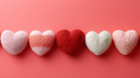 Five handmade heart decorations in various shades of red and pink line up against a vibrant red background, perfect for Valentines Day and romantic celebrations, adding a festive touch.