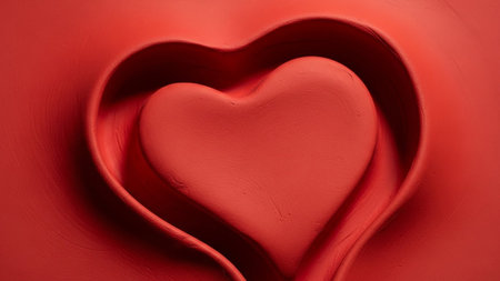 A red heart shape is embossed within concentric red heart outlines, creating a layered effect.