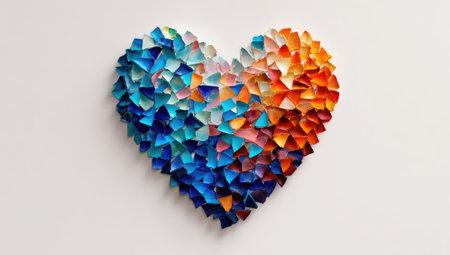 A vibrant heart-shaped design created from many small, colorful, triangular pieces. The piece features a gradient of colors from cool blues to warm oranges, and has a textured appearance. The design is set against a plain, light background. Suitable for use in commercial or editorial projects featuring art, design, or abstract concepts.