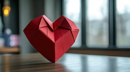 A handcrafted Valentine's Day gift with a heart-shaped origami design, placed on a smooth surface with space for a special message.