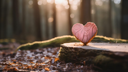Close up of a blush wooden heart in a calm forest. Blurred natural background
