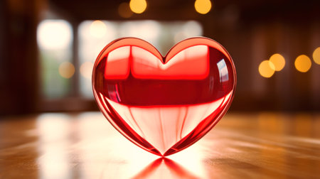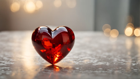 Red glass heart on a bokeh background.