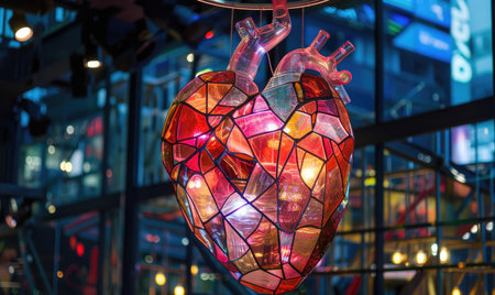 Stained glass artwork featuring a human heart displayed in a contemporary art gallery