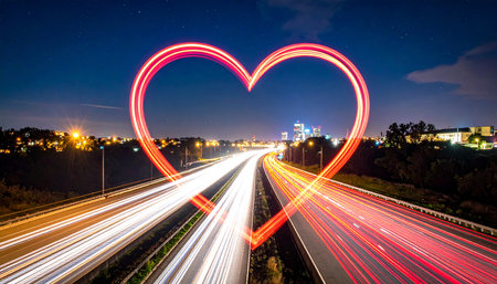 heart shape on the road with car light trails in the city at night