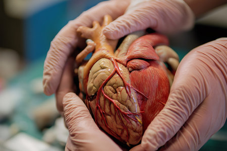 Gloved hands cradle a detailed anatomical heart, showing its realistic textures and colors in a calm, neutral setting of soft light.
