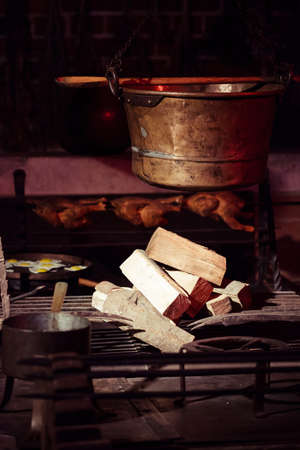 Closeup of old hearth bonfire with pile of fire wood and pot. Indoor.