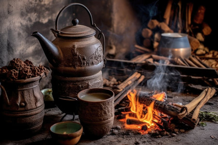 A charming rustic kitchen scene featuring a steaming clay pot over an open fire, complemented by a woven basket, showcasing traditional cooking methods and warmth.
