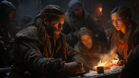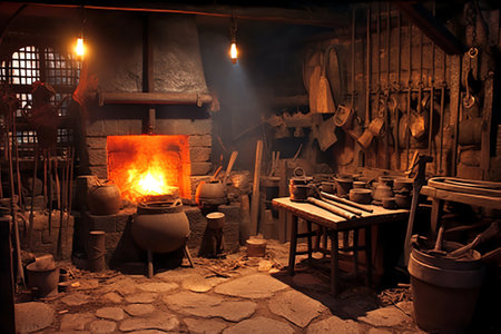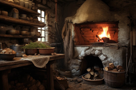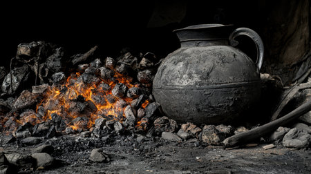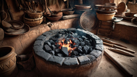 Explore a cozy ancient culinary space featuring a traditional hearth filled with glowing coals and surrounded by artisan pottery and rustic kitchen utensils.