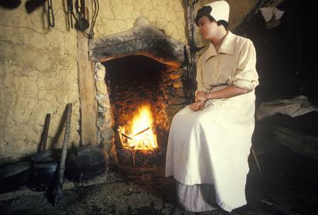 Participant tending fire in historic Jamestown, Virginia, site of the first English Settlement