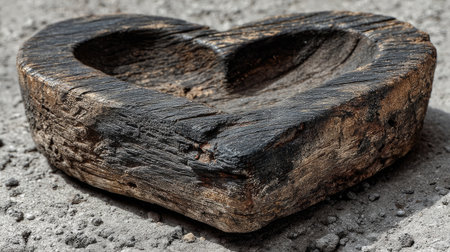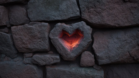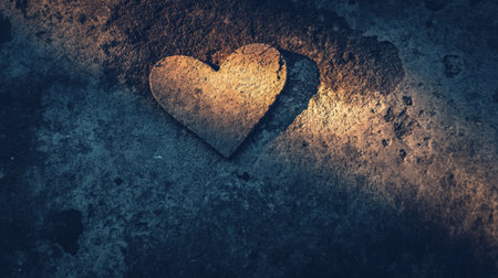 A heart-shaped stone rests on a textured surface, illuminated by soft light, creating an evocative representation of love and connection in a natural, rustic setting.